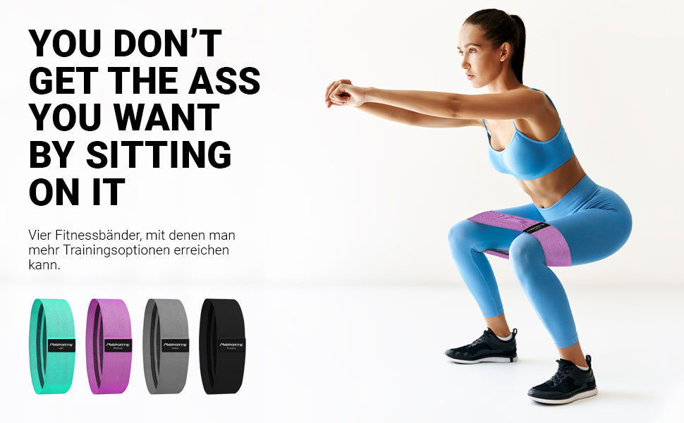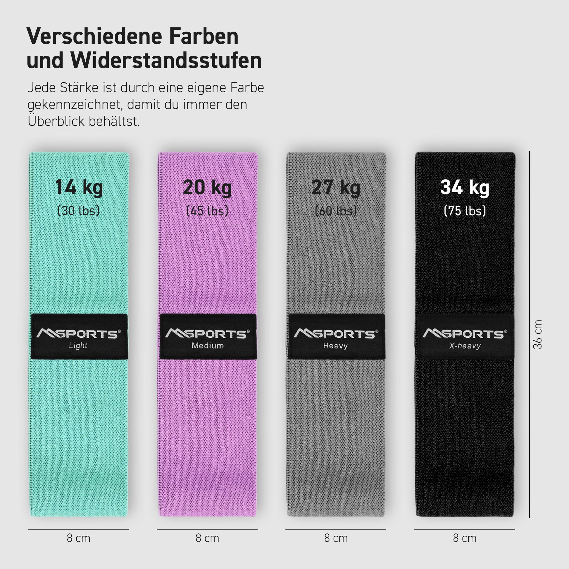 Die Fitnessbänder erhältst du in 4 verschiedenen Stärken, sodass du je nach Trainingslevel dein Workout individuell gestalten kannst.